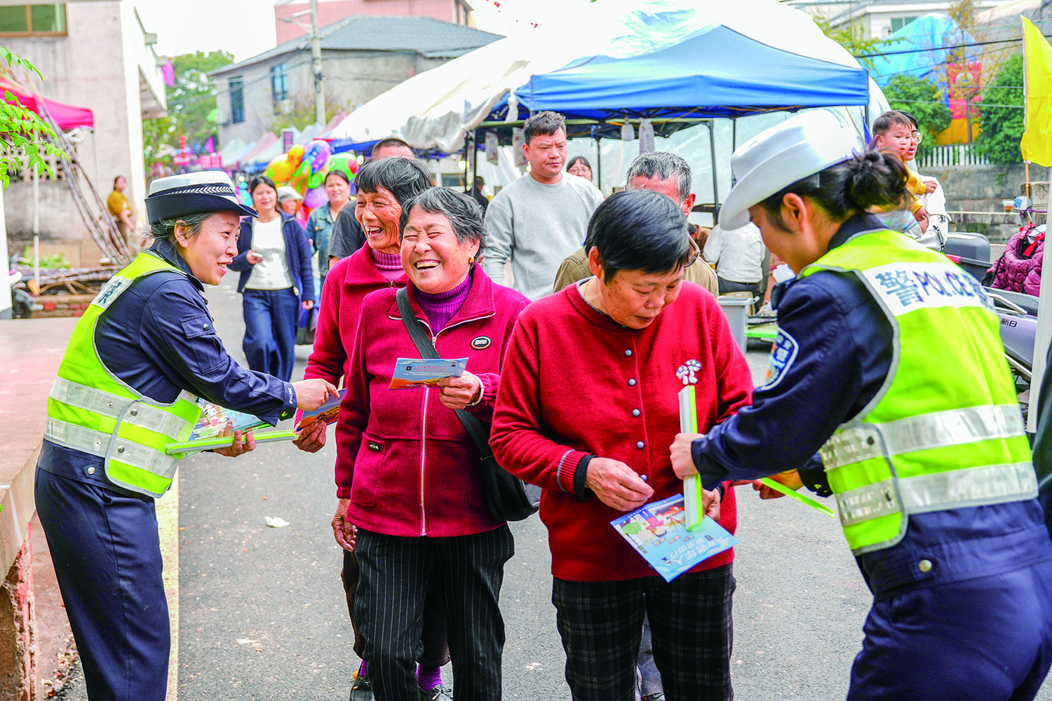 11月10日,兰溪市公安局交通管理大队利用兰江街道万和新村做戏之机,开展冬季交通安全宣传活动,讲解冬季行车注意事项,并给老年人佩戴“反光手环”,让交通安全理念更加深入人心。 通讯员 董剑浩 摄
