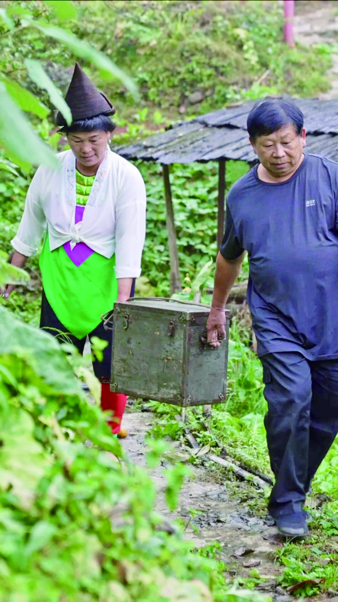 石安林说以前没有公路,他们夫妻俩就用一根扁担挑起两个铁箱,加起来一百多斤的设备,翻山越岭走几个小时。雨天蹚泥水,夜里防塌方,有一次回程路上大树倒塌,车被困在山里,两人借柴刀砍树,头顶还有落石,凌晨两点才到家。但说起这些,石安林只是笑笑:“放电影我很爱好,人家来看,我就觉得很舒服开心。我做这个放映员,人家都很尊重我,我自己也感到很光荣。”