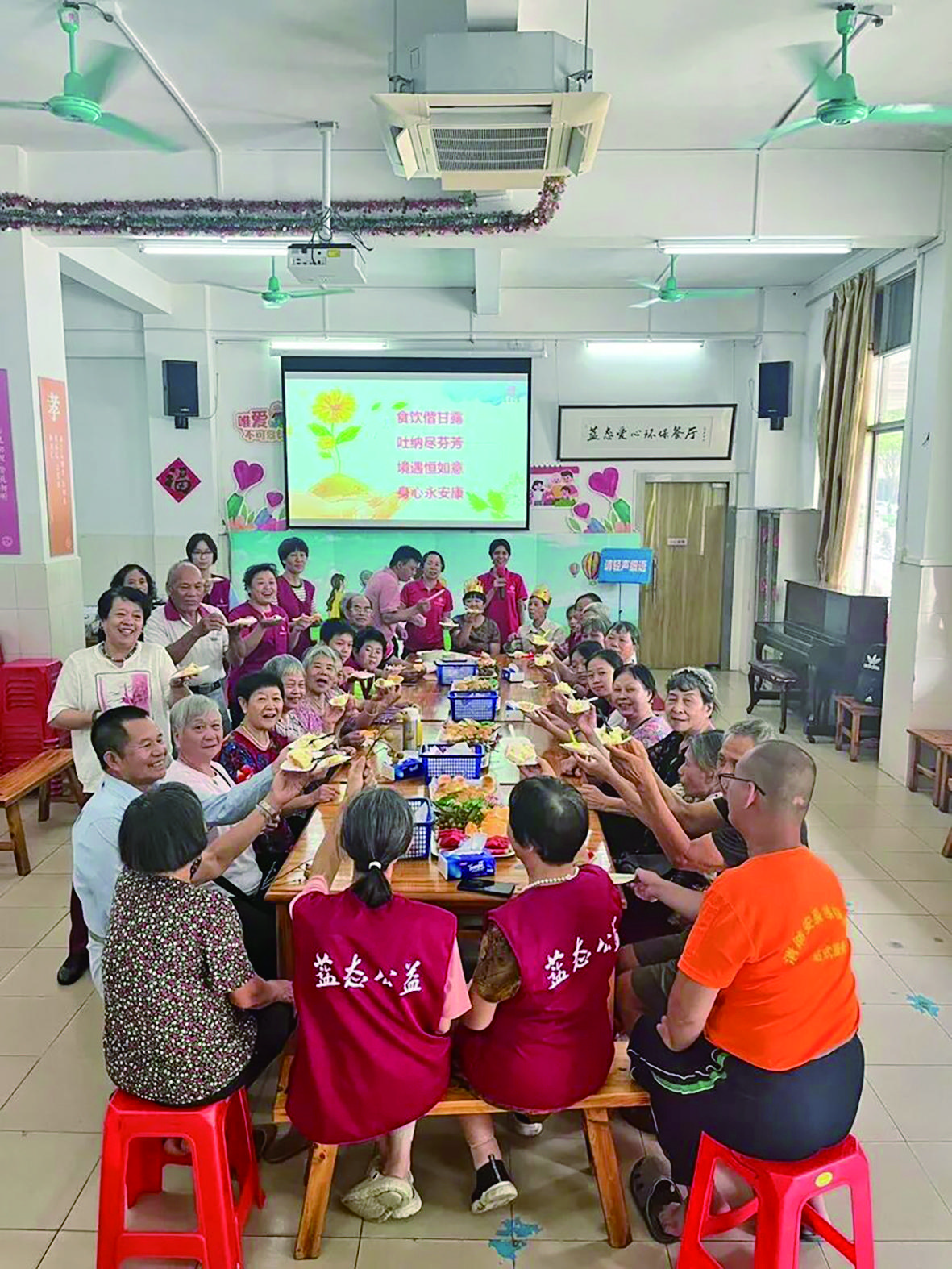 40万份热腾腾的饭菜,背后是无数人的爱心接力。自2017年12月创办以来,除了春节与特殊原因,爱心餐厅每日准时开门,风雨无阻,服务周边60岁以上长者及残障人士,日均接待超过150人。有的老人甚至辗转几十公里,也要赶来。吸引他们的,远不止一顿免费的午餐。每日,老人们在此读诵经典、唱歌、分享;每月,这里有集体生日会、义诊、义剪;逢年过节,还有蓝态公益合唱团和各界爱心人士慰问,粤剧演唱和文艺演出等活动。这里已超越餐厅的功能,老人们来这里,也早已不是为了一顿免费午餐,而是因为这里家一样的温暖、关爱和开心快乐。