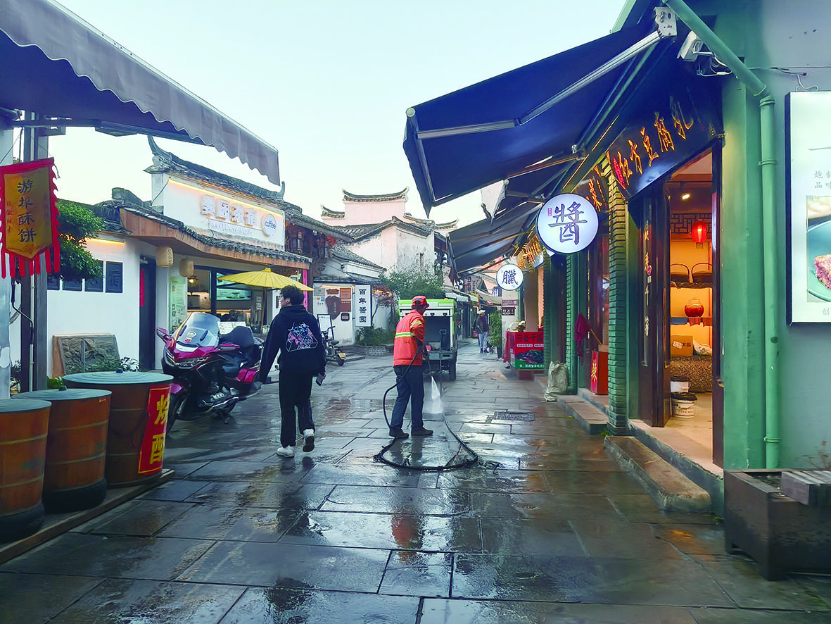 近日,在兰溪市游埠镇的古街上,环卫工人通过专业清洗设备对街道进行保洁,守住古街的“颜值”。