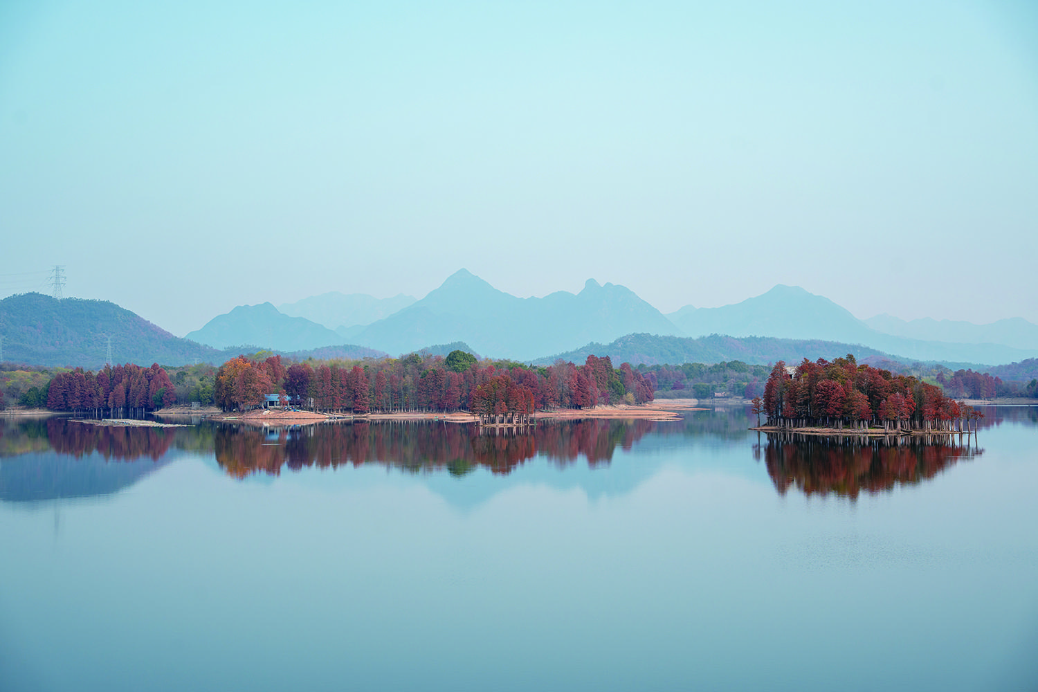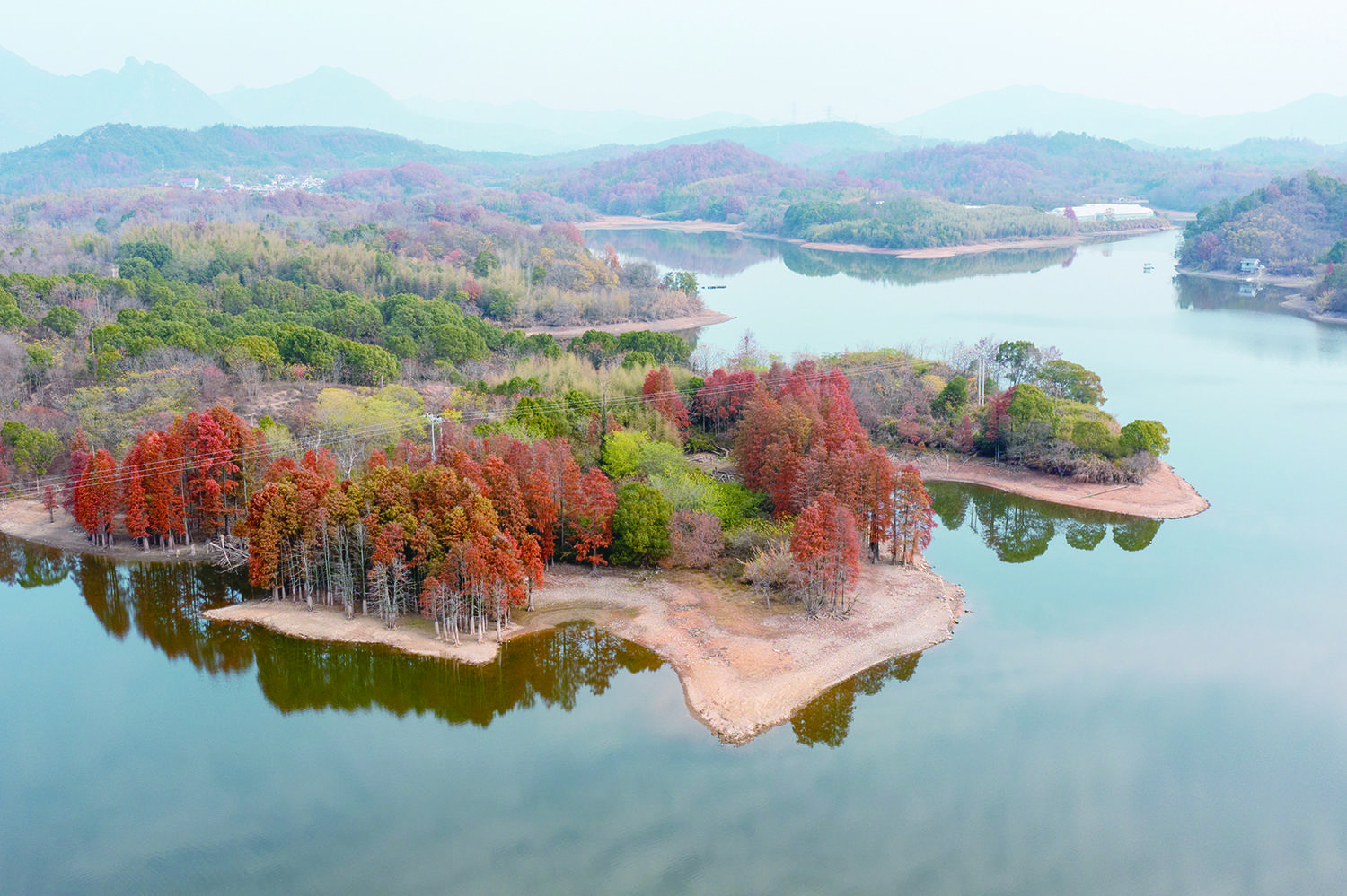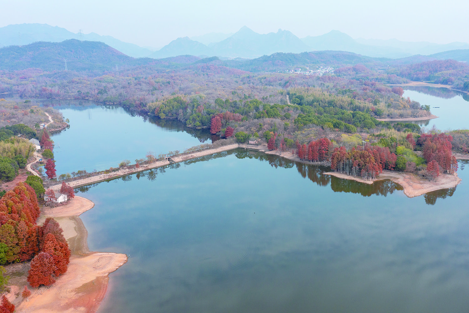 热烈的红、明艳的黄、澄澈的蓝……昨天,记者在东风水库金山头库区看到,在蓝天白云的映衬下,水库层林尽染,树木呈现出红黄绿相间的斑斓色彩,与清澈的湖水相互映衬,展现出如诗如画的生态美景,宛如一颗镶嵌在大地上的璀璨明珠。