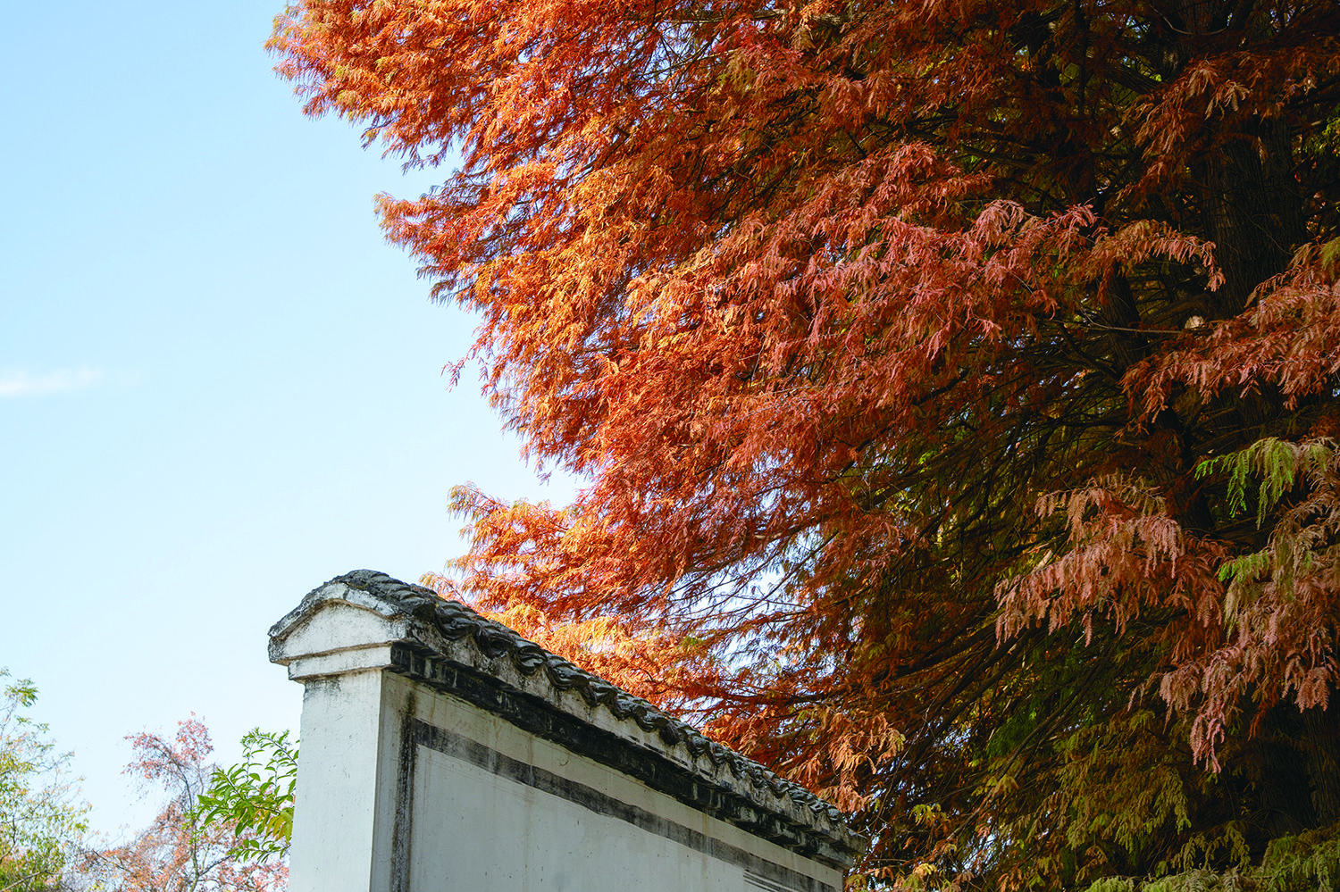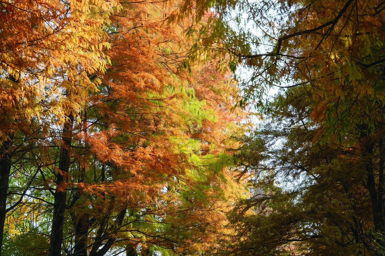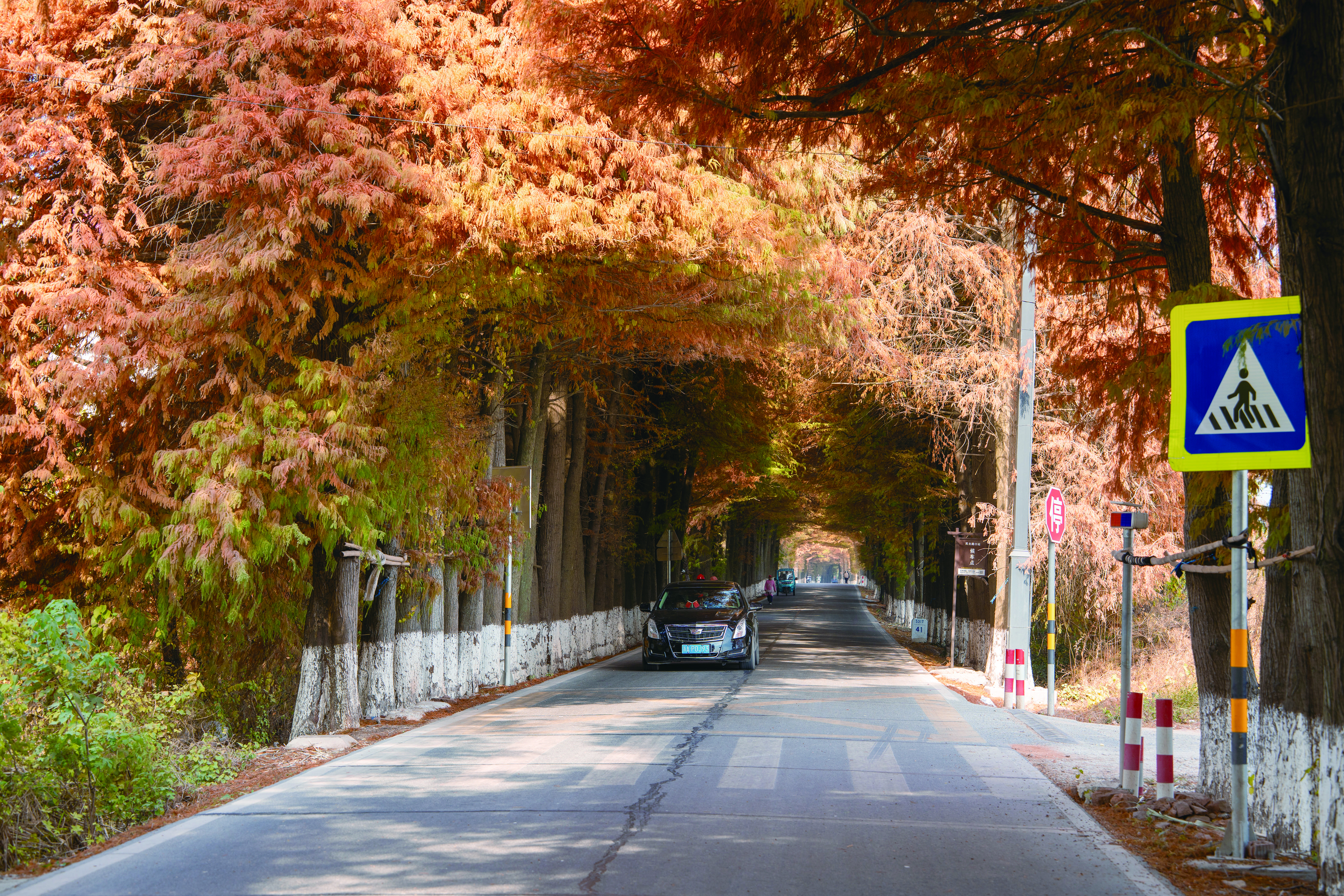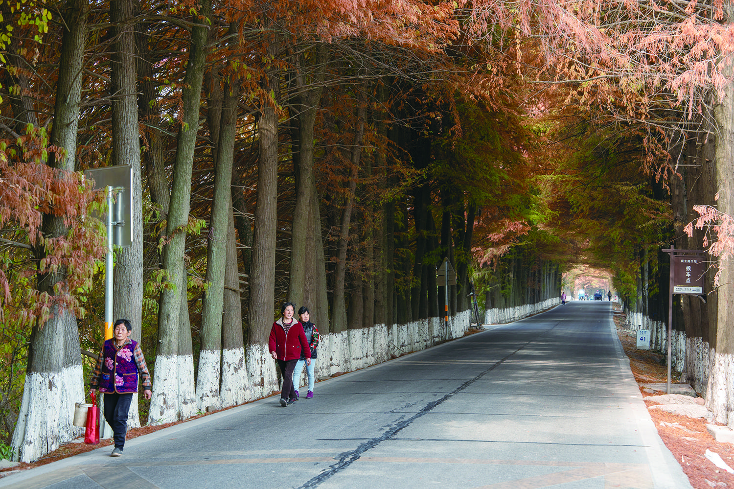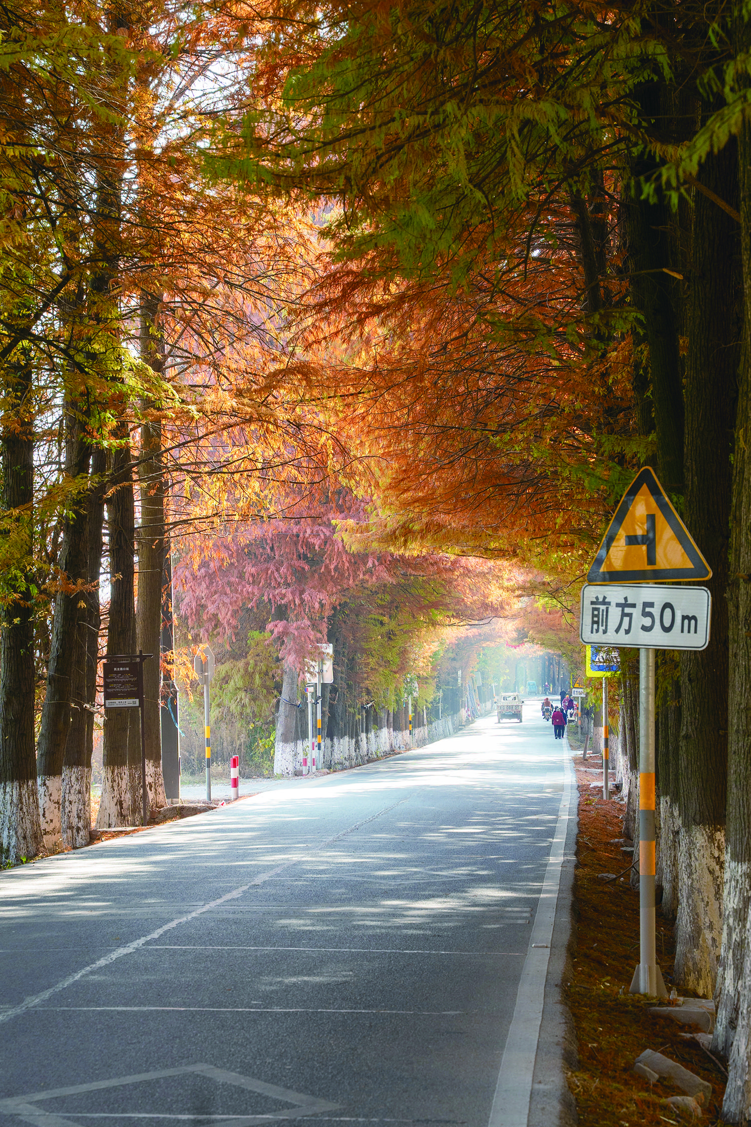 近日,在兰溪市女埠街道女后线,公路两侧的水杉进入最佳观赏期,这些水杉树叶红绿相衬、色彩斑斓,树枝“左手牵右手”,交织成一道天然的金色拱门,绵延数公里,行人车辆往来,宛如穿梭在时光隧道中,成为一道靓丽的风景线,吸引不少游客前来打卡。