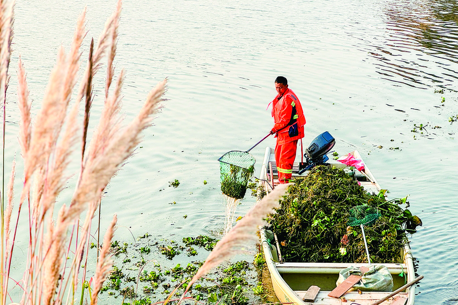 12月17日,在兰溪市区西门码头,市城投养护工人正在巡河护水,清理江面漂浮物。