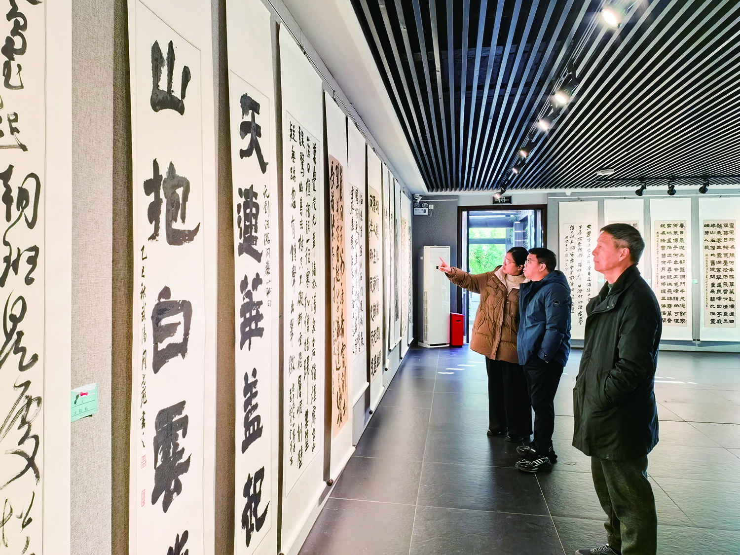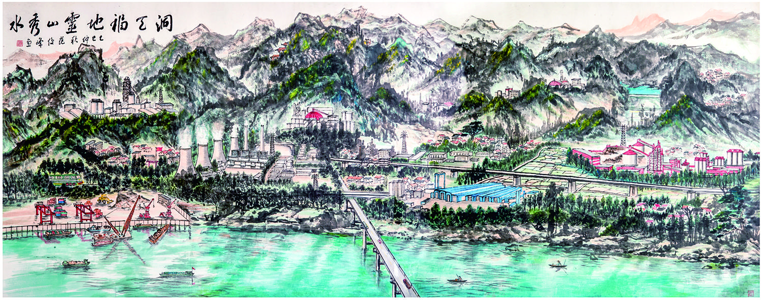 兰溪市灵洞乡紫岩书画院负责人范俊峰的国画作品《洞天福地 灵山秀水》是本次展览中篇幅最大的展品。“这幅作品花费了我数月时间创作,灵感来源于整个灵洞乡的航拍全景,把灵洞乡的主要产业、企业与山水融合在一起。”范俊峰表示,他想通过将古代诗人、文人作品中灵洞乡的秀丽山水与如今经济发展的时代主题相融合,描绘出跨越千年的山水、产业对话之感,既展现了自然之美,又传承了时代内涵。