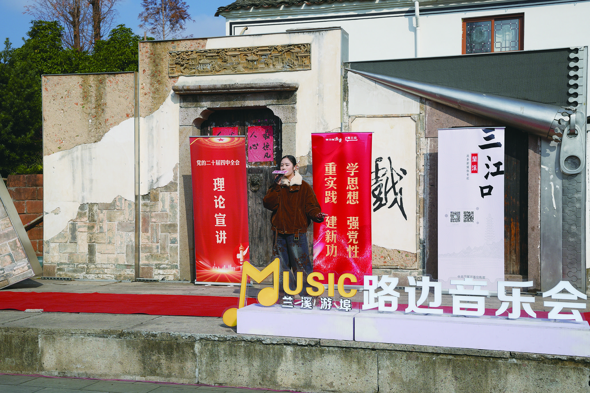 活动中,土生土长的游埠人严龙兴以一首原创的《早安游埠》点燃现场——“这是咱游埠自己的歌!”紧接着,《水手》的经典旋律响起,《光亮》《好运来》《明天,你好》等歌曲轮番登场,流行、民谣、复古曲风交织。