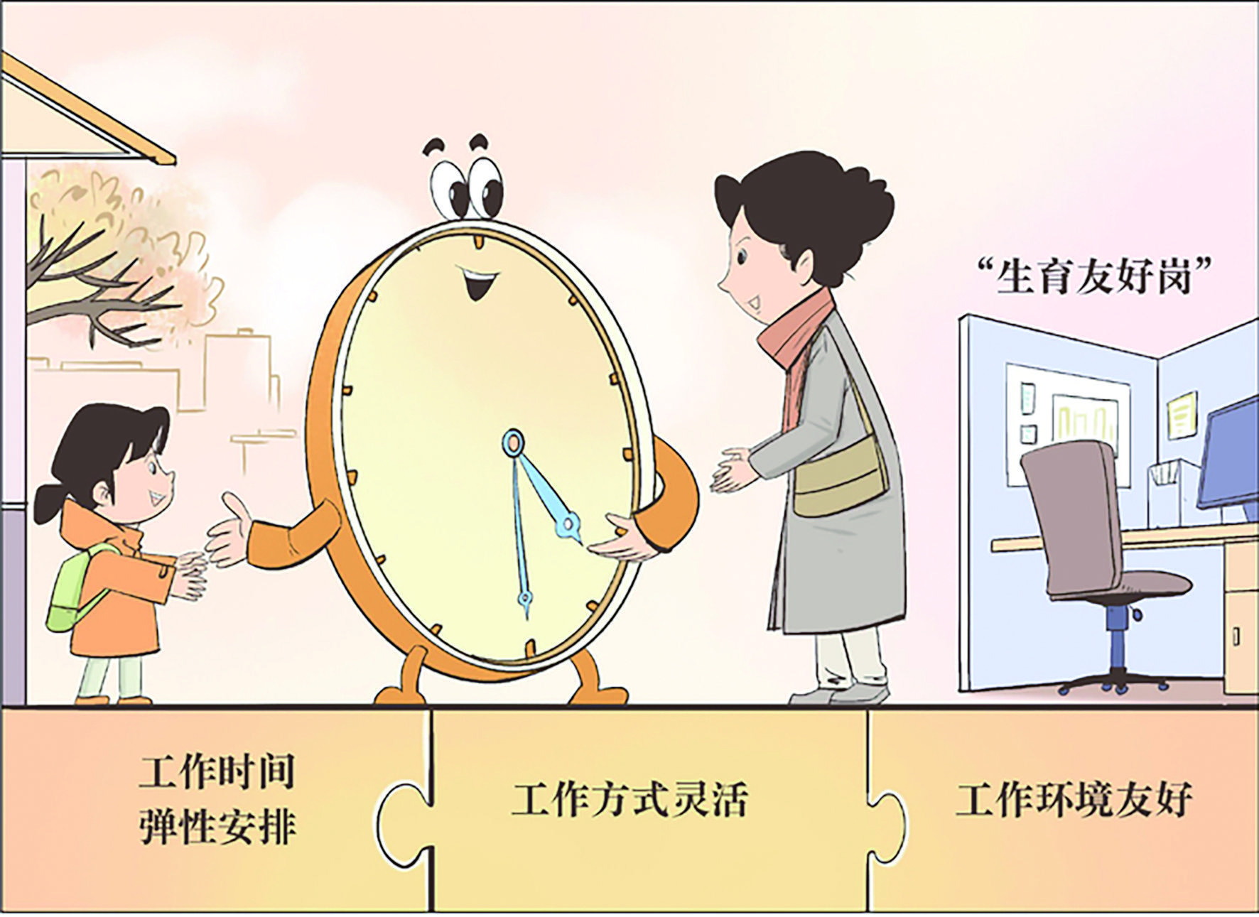 在上海黄豆网络科技有限公司,下午4点半,运营负责人刘女士合上电脑,起身去接放学的孩子。她不是提前“溜岗”,而是公司实行了弹性工作制。此类工作时间可弹性安排、工作方式灵活、工作环境友好的岗位,被称为“生育友好岗”。上海启动“生育友好岗”就业模式试点已一年有余。这一模式实际成效如何?能否帮助职场父母减压,更好平衡上班与带娃?