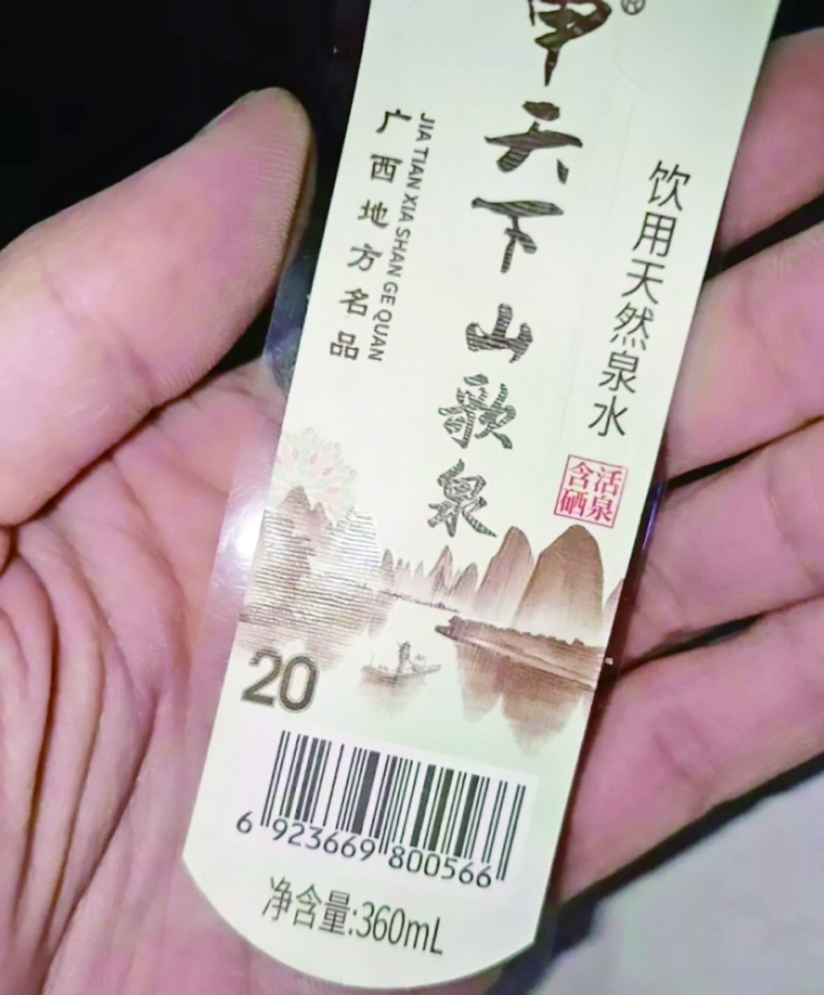 近日,有网友在社交媒体发帖称,广西某矿泉水包装标签上印有与20元人民币背面高度相似的图案,质疑企业违规使用人民币图样。