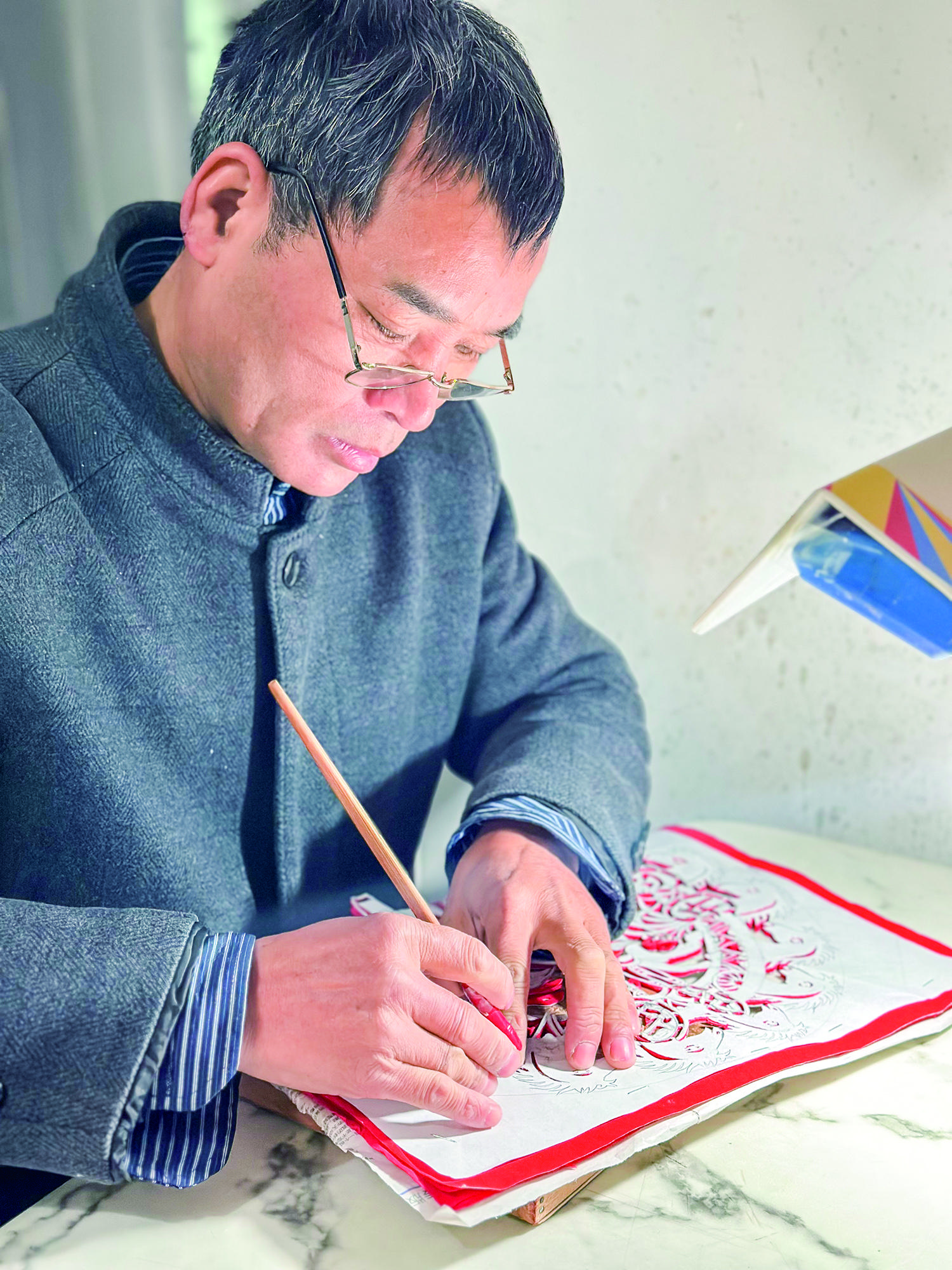 在吴友清看来,剪纸是一门凝聚心灵的艺术,不仅需要持之以恒的恒心、细致入微的细心,更离不开一丝不苟的态度。“剪纸作品往往有很多细小的纹路,稍微分心手一颤,就可能剪断关键部位,整个作品就毁了,所有努力都白费。”三十年磨一“剪”,如今的吴友清早已练就“火眼金睛”和“巧手匠心”,一张纸该折几折、在何处下刀、如何把控力度,他只需扫一眼图案便了然于心,刻刀在手中仿佛有了生命,行云流水间便能勾勒出精美的纹样。