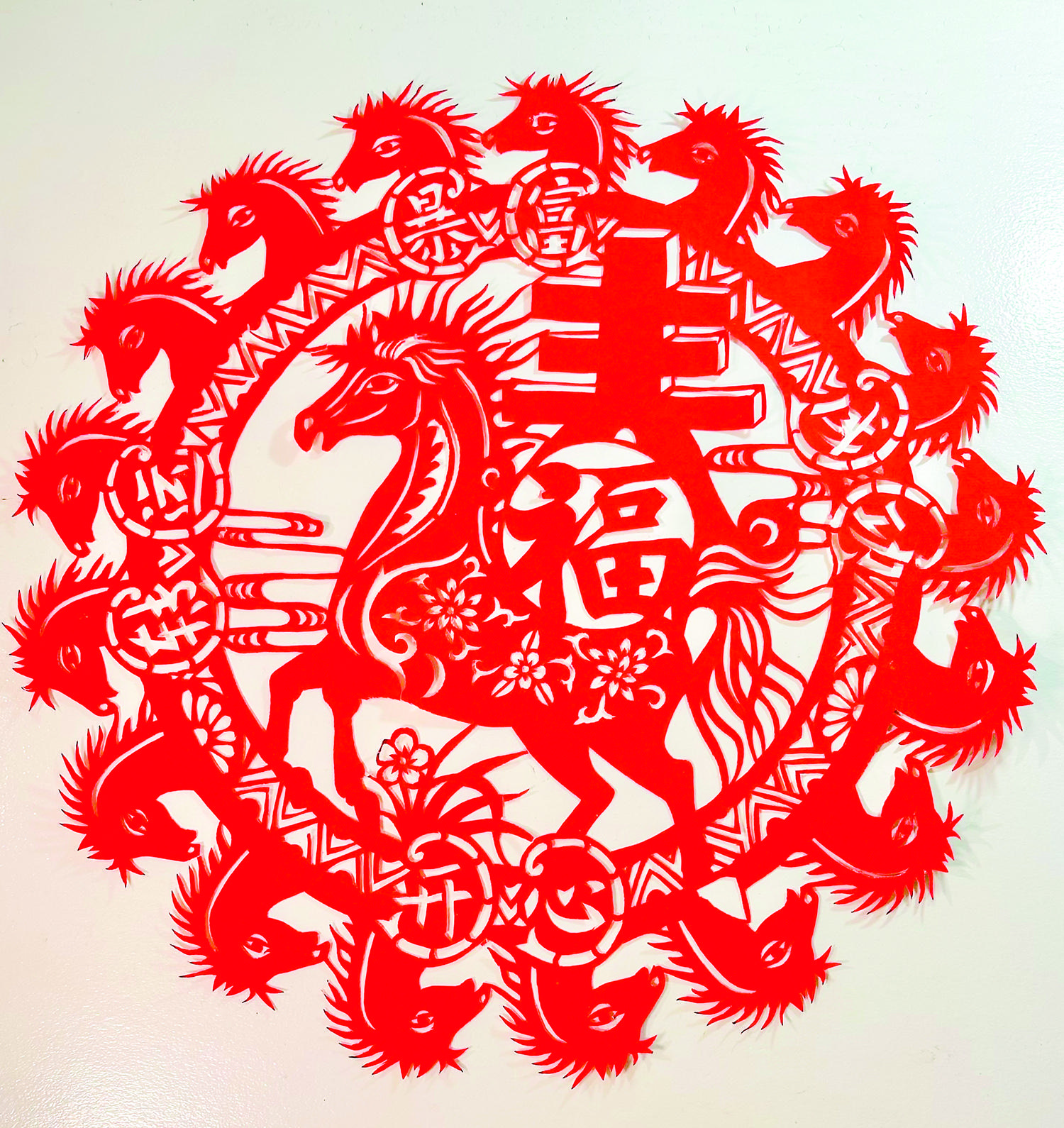 当吴友清将《万马奔腾迎新春》贴在窗户玻璃上时,顿时满屋喜庆。这幅剪纸以18匹马为核心元素,巧妙融合“马上转运”“马上暴富”“马上成功”“马上开心”等吉祥寓意。剪纸之上,中间的骏马奔腾的姿态栩栩如生,花开富贵等传统图案点缀其间,尽显剪纸技艺的精巧灵动,为即将到来的新春佳节增添了浓浓的非遗喜庆年味。