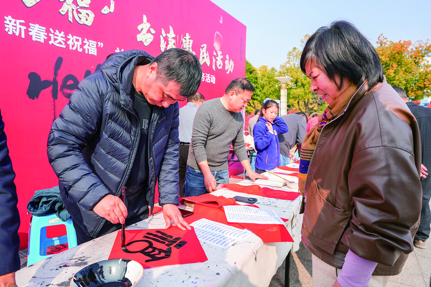 1月17日上午,由兰溪市文联主办的“迎新春 送万福”书法惠民活动在市府广场举行。12位书法家现场挥毫泼墨,笔走龙蛇,将美好祝愿跃然纸上。不少市民围在桌前,一边欣赏精湛的书法技艺,一边挑选心仪的“文化年货”。 记者 丁 成 摄