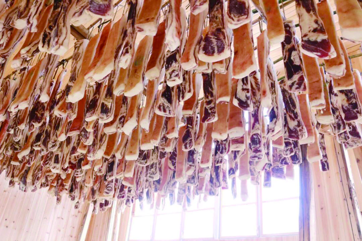 兰溪地处浙中,三江汇流,群山环绕,湿润气候与独特地形造就了制作腊味的天然优势。尤其是梅江镇转轮岩一带,冬季寒风从北方吹来,被龙门山脉阻挡,一部分流入兰溪转轮岩地区后又受金华北山所阻,在低洼盆地形成回旋气流,风干湿度恰到好处——无需过多盐分,便能让肉品在自然风的滋养下慢慢蜕变,既不腐烂变质,又能锁住食材本味。