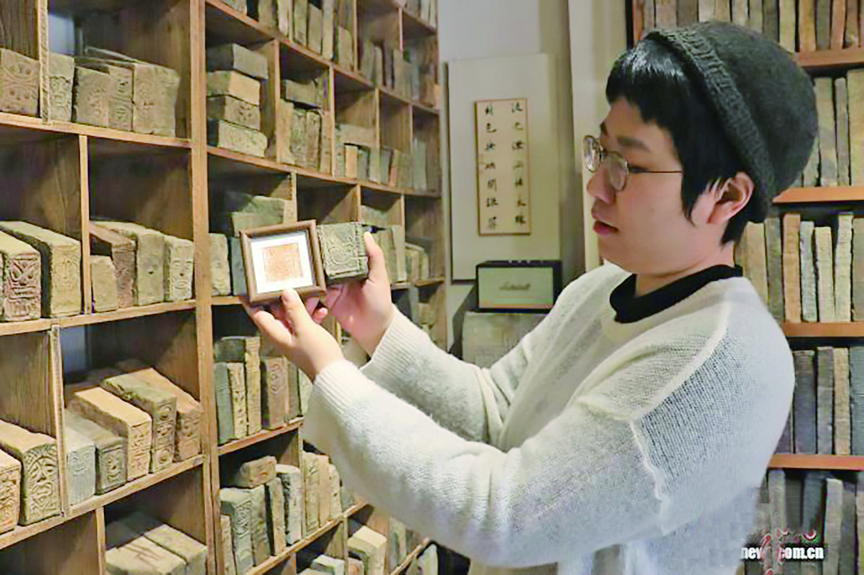 杭州一家古砖收藏馆陈列着三千余块千年古砖,成为当地市民了解、体验古砖文化的好去处。1月15日,该馆主理人之一、“95后”青年马雨介绍,馆内七成古砖产自浙江,多来源于当地乡野老屋及古砖藏家。图为马雨展示根据古砖纹样制作的文创产品。
