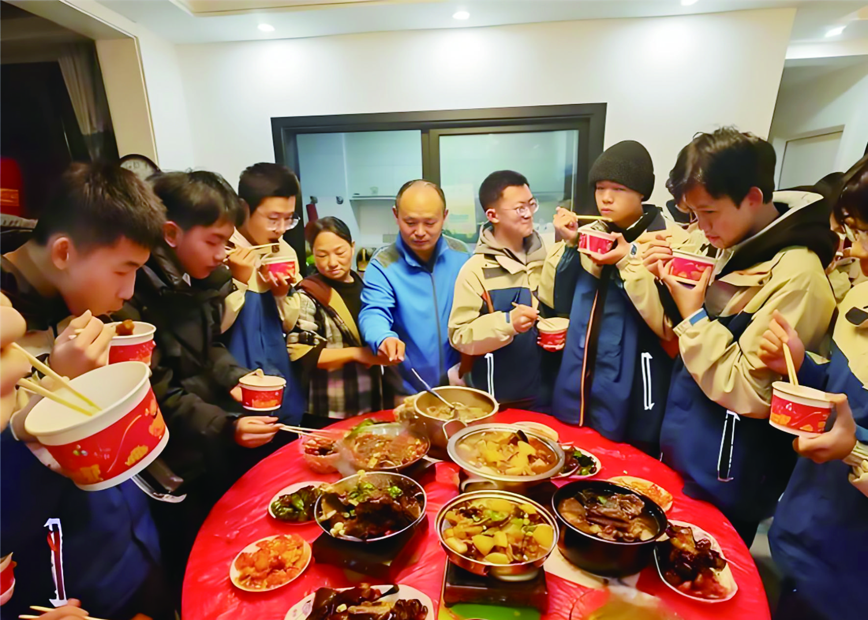 “我最爱吃程老师做的牛杂火锅,餐馆的大厨都烧不出这个味道!”1月14日晚,在湖北黄石市阳新县华成新都小区内,阳新一中高三年级主任程志勇家中挤满了26名学生,他们围在桌前,一边吃着程老师亲手做的美食,一边评论着哪个菜最好吃。