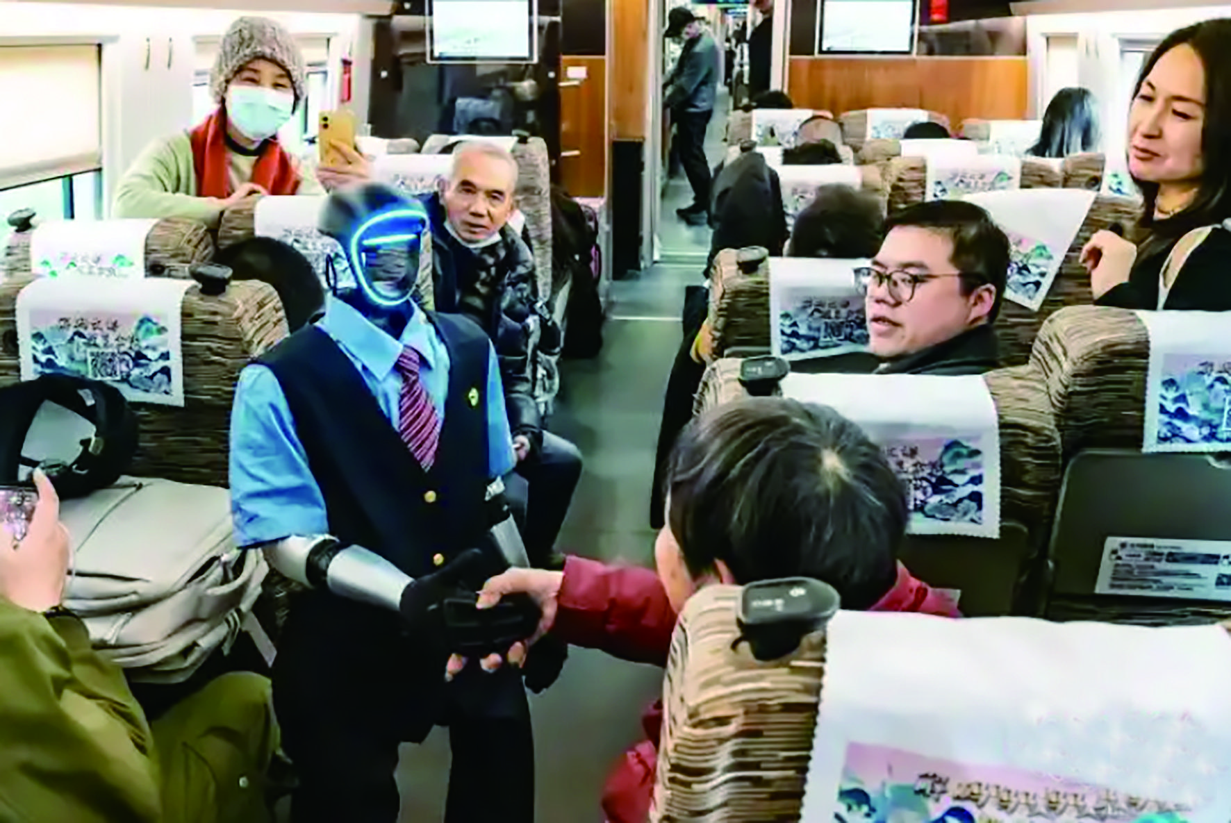 2月10日,编外乘务员“福兴”机器人登上列车,开启新一天的“上班日”。今年春运期间,“福兴”机器人亮相铁路杭州客运段“西子号”列车,为旅客提供列车信息咨询、互动问答等服务。图为穿着铁路制服“上班”的“福兴”机器人。