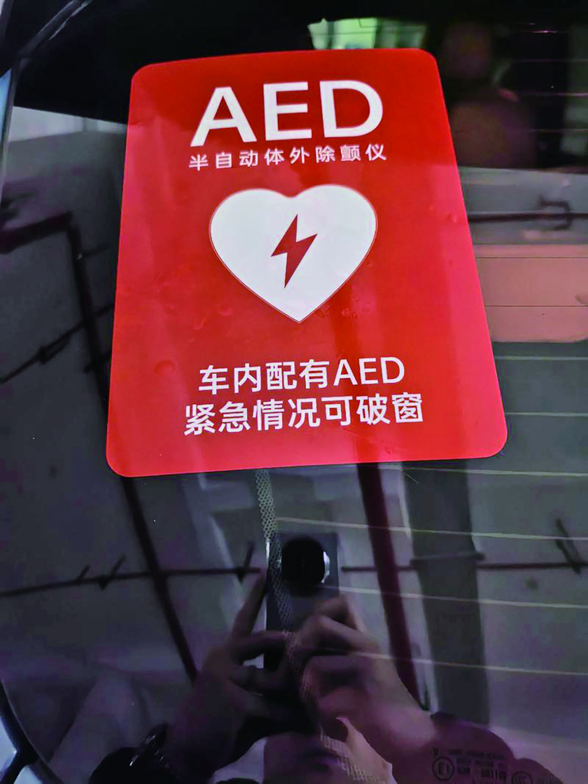 记者了解到,近年来已有部分车主像李先生一样,自费在车内配置AED,并在车窗贴上“车内配有AED,紧急情况可破窗”的提示标识。