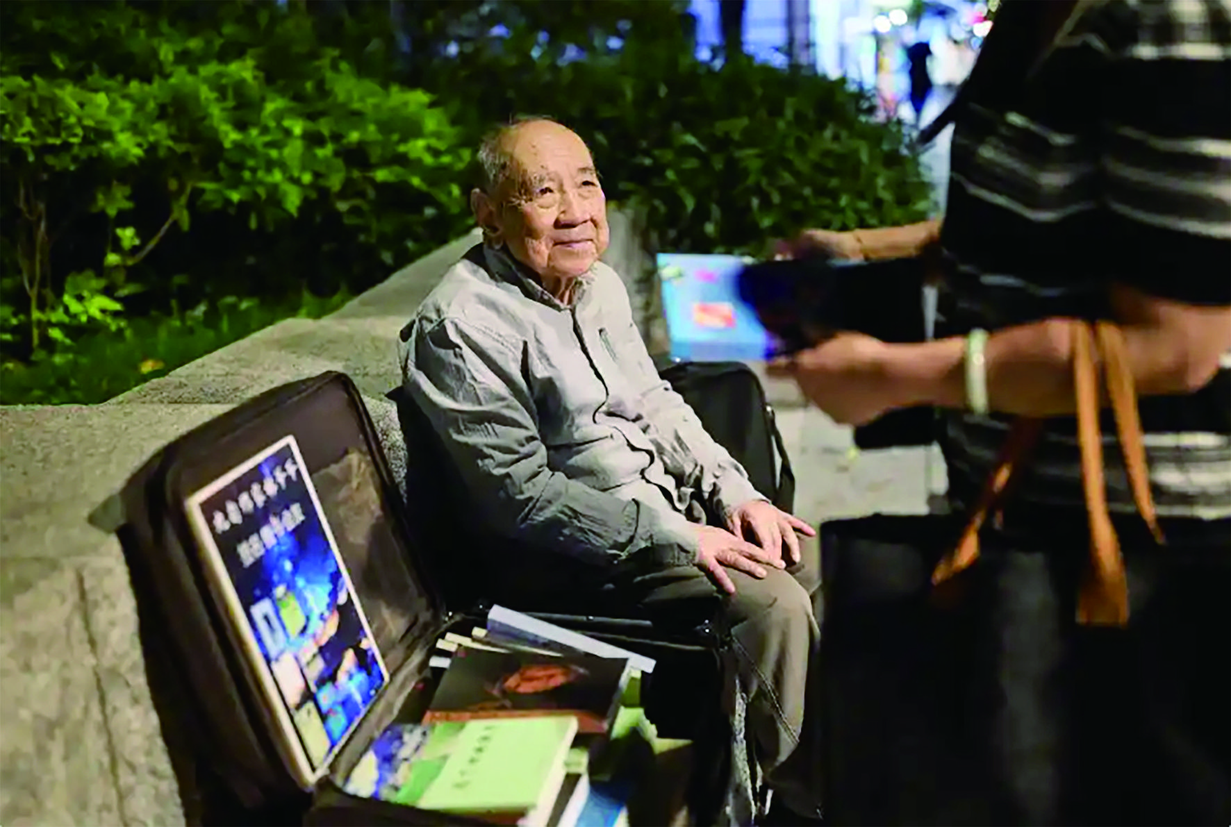 “看看书”“看看书”……92岁林宝山的吆喝声几不可闻,很快淹没在地铁进出口过道内人来人往的嘈杂声中。年轻人大都低头看着自己的手机,手中没有拿着手机的人也专注地赶路,林宝山尽量不错过每个投过来目光,与之对视,回以招手“看看书吗?”