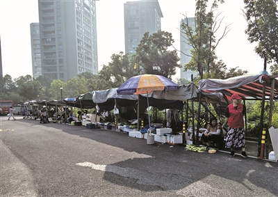 “自己种的黄瓜,早上刚刚摘的,要不要来一点。”6月30日清晨,记者来到东洲街道逸城社区,这里的生态停车场内有一个小型的“农贸市场”——这是经过治理后的自产自销便民区。这里划设了18个标准摊位,配备分类垃圾桶,既避开主干道,又为摊贩安下“家”。
