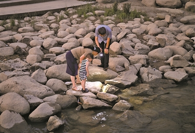 前天,晚饭后,趁着气温凉爽,不少孩子在父母的带领下,来到富春江边抓蟛蜞。其中一名家长打着手电,母亲和男孩循着光亮,在石缝间仔细寻觅蟛蜞的踪迹。