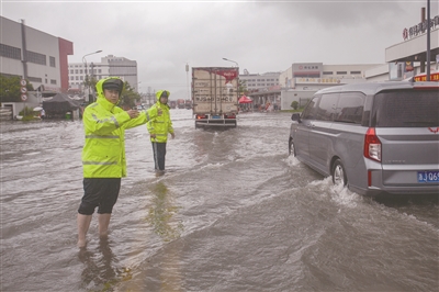 7月8日,浙江省台州市公安局交警支队直属二大队院桥中队民辅警在台州市黄岩区院桥镇一路段积水处执勤,确保道路畅通。为应对今年第4号台风“丹娜丝”,水利部7月7日对浙江、福建启动洪水防御Ⅳ级应急响应。