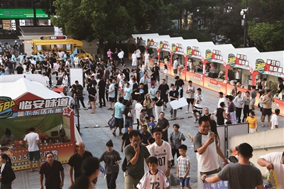 北广场上,设有小舞台,开展舞蹈、演唱等各种活动。整个市集活动将持续至7月21日比赛结束。不少球迷表示,这不仅仅是一场篮球比赛,更是一场吃喝玩乐购一站式游玩体验。