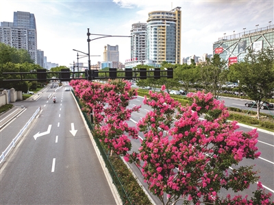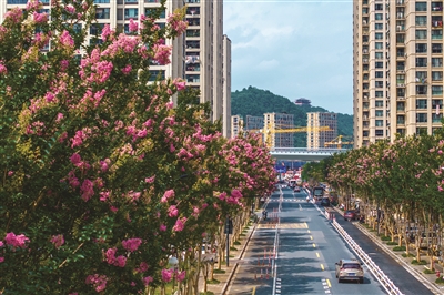 在恩波大道,一树树高大的紫薇在绿叶的衬托下显得格外鲜艳,尤其是在恩波大道与大桥路交叉口附近,十余株6米多高、树冠饱满的紫薇格外令人惊艳。只见一串串、一簇簇粉红色花朵缀满枝头,在夏日湛蓝天空的映衬下,色彩饱满而纯粹,仿佛沾满颜料的画笔笔尖上凝聚的一滴粉,将滴未滴,娇嫩极了。因为花量多且密,绿叶也退让了三分,远远看去就是一颗颗巨大的亮粉色花树,浪漫又壮观。据区城建集团环养公司相关负责人介绍,恩波大道上有四川红花紫薇、美国紫薇100余株,平均高度达到5米左右、冠幅在4.5米左右,其中美国紫薇的冠幅超过6米,就像一把把华丽的大花伞,在夏日为人们带来一抹浪漫。
