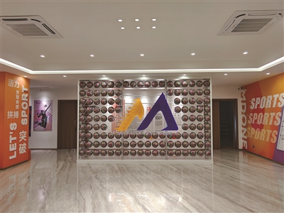 在美动体育的产品展厅,陈列着款式不一、颜色鲜艳的数十款篮球、足球、排球产品。