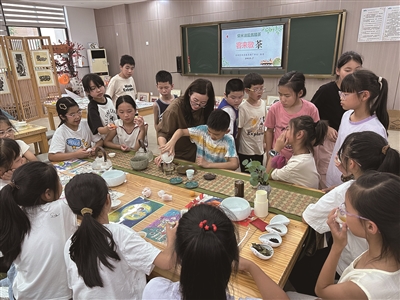 在胥口镇新时代文明实践所,一场茶艺课堂正散发着沁人茶香。区文化特派员杨青化身“茶艺导师”,带领孩子们走进茶文化的世界:从认识茶叶品种、了解泡茶器具,到学习优雅的冲泡步骤,孩子们目不转睛地盯着老师的示范,不时发出惊叹:“哇,原来喝茶也可以这么精致呀!”亲身体验环节,孩子们模仿着温杯、投茶、注水,动作虽稚嫩却专注,一杯杯香气四溢的茶汤在手中诞生——他们品到的不仅是茶的滋味,更是传统文化的韵味。
