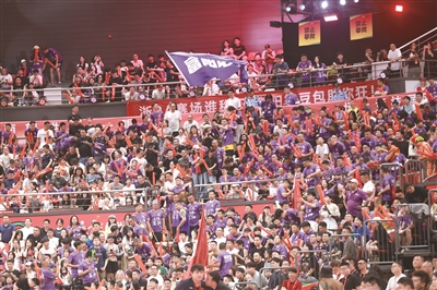 “富阳队那个!吼嘿!……”随着比赛的进行,身着紫色衣服的球迷们整齐地唱起为富阳队助威的歌曲,同时挥舞着手中的加油棒,碰撞声汇成密集的鼓点。