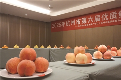 粉嘟嘟的水蜜桃、金灿灿的黄桃、红艳艳的油桃……评选现场,满屋的浓郁桃香让人心醉。评审过程中,先由会务组专业人员对鲜果的果实大小、果实可溶性固形物进行测定;再由来自省农业技术推广中心、省农业科学研究院、浙江大学的相关专家组成专家评审团,根据桃子的外观指标、内在品质指标、专用包装等方面进行综合打分,最终评选出2025年杭州市“金牌品质”鲜桃10个和优质奖若干。富阳鲜桃再次大放异彩,参选的6个产品揽入3金3优质奖。