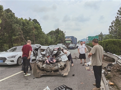 当日上午7时,尤田苗与妻子驱车从富阳出发,前往湖北老家探亲。10时30分许,车辆行至G56杭瑞高速鄱阳服务区附近时,前方路面的异常状况引起了他的警觉。“当时看到一辆半挂车横在路中间,旁边还有一辆小轿车车身严重受损,感觉是刚发生的交通事故。”尤田苗回忆道,“现场还没人上前帮忙,我知道这种时候多耽误一秒,被困人员就多一分危险。”
