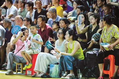 在金竺村球场旁边的空地上,高一学生朱艺沁和父亲支起一个摊位,售卖绿豆汤、柠檬水、脆皮烤肠等。“我正好放暑假,想赚点零花钱,就出来摆摊,而且我本身就喜欢篮球,从小学就开始打球了。今天生意很不错,天气热,来买饮品的人挺多。”她说。
