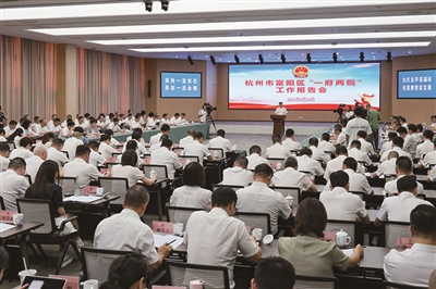 本报讯(记者 许荆楠 臧一平 摄影 朱啸尘)昨日下午,富阳区举行2025年“一府两院”工作报告会。区委书记王牮参加会议并讲话。区委副书记、区长谢渐升报告上半年全区经济社会发展情况、下半年主要工作,并专题报告全区生态文明建设情况和法治政府建设情况。区人大常委会主任徐林亮主持会议。