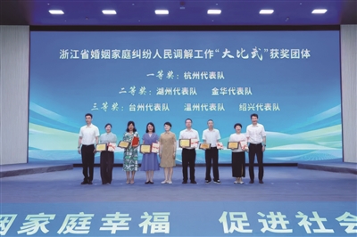 本报讯(记者 朱啸尘 通讯员 朱欣彤)日前,由浙江省妇联、省司法厅联合主办,杭州市妇联、市司法局承办的全省婚姻家庭纠纷人民调解工作“大比武”活动圆满落幕。在这场汇聚了全省11支代表队婚调精英的巅峰对决中,来自富阳区婚调委的许洁峰凭借扎实的专业功底和出色的临场发挥,助力杭州代表队从强手如林的竞争中脱颖而出,摘得团体一等奖的桂冠,个人也斩获三等奖,并成功入选首批“之江和姐”。