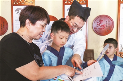 上午8:30,家长带着孩子陆续抵达安禾村家风馆。换上“小书童”服饰,戴上小方巾,衣袂飘飘,孩子们仿佛穿越回了南宋时代。“欢迎来到我的家乡安禾村。”在“公清宰相”李宗勉(区级文化特派员、区图书馆工作人员沃思炀扮演)引导下,孩子们认真学习古代揖让之礼,弯腰、拱手、行礼,一举一动间尽显传统礼仪风范。