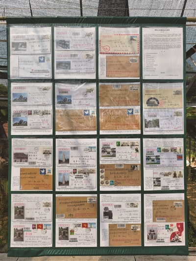 图版上的邮品一般是公函封或者是纪念封,邮封上有纪念设施的实景图、与实景图匹配的抗战主图邮票、与纪念设施对应的邮戳。“我们希望全方位、多角度解读每一段抗战历史。”陆人淼坦言,邮品的准备过程并不轻松,比如实景图,一部分是由区委党史研究室提供的,其他的都是他自己驱车前往现场拍摄。这些邮品都是“实寄封”,即都是从当地寄到陆人淼家中的。信封上都有当地村镇相关负责人的签名,有时遇不上负责人,陆人淼就要再跑一趟。“跑”对于他来说早已是家常便饭,他说“幸好自己会开车,走访搜集资料方便很多”。