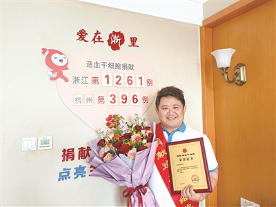 本报讯(见习记者 杜伊婧 记者 王大原 周晓露)9月9日,在浙江某医院造血干细胞采集室内,一场跨越6年的生命接力正在上演。来自富阳大源镇的“90后”退役军人朱军杰成功捐献196毫升造血干细胞悬浮液,成为富阳区第52位、第53例造血干细胞捐献者。