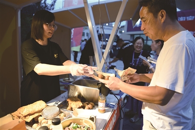 隔壁摊位上,龙门三宝负责人孙树峰忙得不可开交,针对“浙BA”配套市集,他专门开发了“酒酿馒头夹牛肉”,每次出摊都会被一抢而空。摊位前的孔先生正在品尝这款“中式汉堡”,随后又尝起龙门面筋。“以前没吃过,很特别,味道也很好。”孔先生从金华赶来,他热爱篮球运动,这次专门赶来看丽水队“球星”倪豪凯,他说到富阳肯定要吃点当地特色美食,龙门三宝这些美食,让他很满意。
