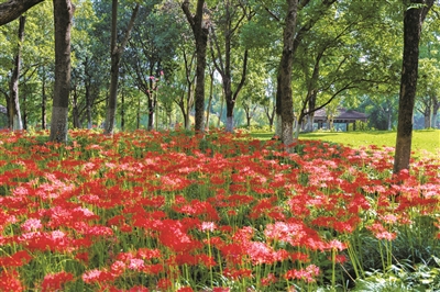 本报讯(记者 吴璇 摄影 朱啸尘 通讯员 王文文)近日,东吴文化公园、儿童公园等公园相继开出了一片片火红的石蒜花,仿佛在庆祝即将到来的国庆节。石蒜盛放也引得游客纷纷驻足欣赏拍照。
