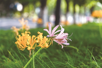 据区城建集团环境综合养护公司相关负责人介绍,石蒜因其独特的造型和生长习性,被越来越多地应用在城市绿地中,为相对单调的林下空间增添亮色。近年来,环境综合养护公司秉持“彩化”“美化”的城市绿化种养方针,根据不同的环境、季节,因地制宜,种植丰富多样的植物品种,营造更加美好的城市环境,石蒜就是其中一个“新成员”。主要种植地集中在东吴文化公园、儿童公园、恩波公园等,大多为红色石蒜,还有少量为黄色。为了避免因其花开叶未展、出叶花已谢的习性而出现花开时黄土裸露的情况,环养公司将石蒜的鳞茎与麦冬草或花叶玉簪等地被植物套种,用这些地被植物的叶片弥补石蒜花开时的绿叶底色。