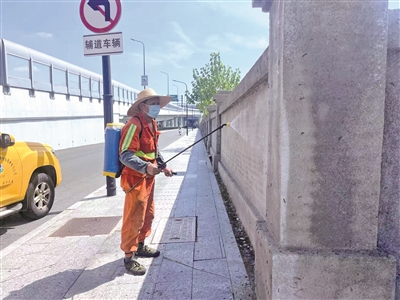当天,三名养护师傅足足用了3桶杀虫药水,将人行道和围墙统统喷洒了个透。“围墙锁着,我们进不去,只能将爬出来的虫子先灭杀。次日,我们对路面进行了清洗,这几天路面几乎没有再看到虫子了。”绿化保洁中心负责人说,“得益于绿化、环卫联动,我们发现问题当即就能统筹处理,避免给市民造成更大的困扰。后续我们将继续关注,将虫害阻断在围墙外。”