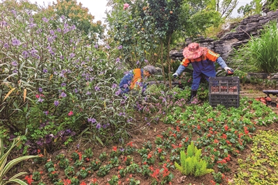9月24日上午,江滨西大道依江路路口的三角绿地内,养护师傅们正忙着栽种各种时花。矮牵牛、蓝雪花、五星花……一株株时花被养护师傅小心翼翼地在育苗盆里取出,再栽种到绿地里。红色、粉色、紫色、蓝色……很快,各色小花就整整齐齐地拼出一个色块,原本绿意盎然的花境,也逐渐被色块点缀成一个姹紫嫣红的小花园。