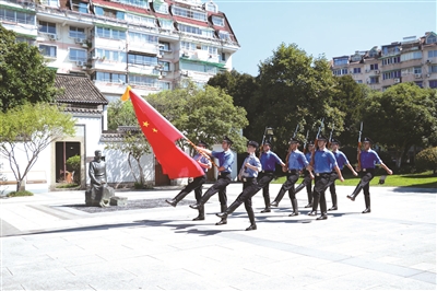 每周一,无论风雨,区政府机关大院的升旗仪式从不缺席。2018年国庆节时,区政府北门人潮涌动,16名队员第一次正式亮相国庆升旗仪式,他们迈着整齐的步伐护送国旗出场,国歌响起,红旗升起,现场市民肃然起敬,爱国情怀在那一刻凝聚成温暖的共鸣。从此,每年国庆节的公众升旗仪式,成了富阳人心中不变的“红色约定”。