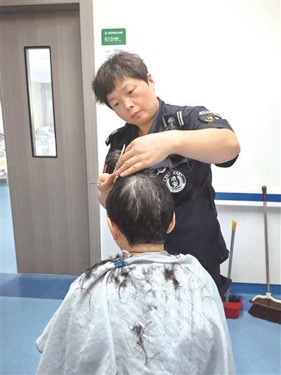 “阿姨,您看这个长度行不行?剪短点清爽,也好打理。”昨日上午,区三院中西医结合精神科病区里,49岁的女保安徐香莲手持理发剪,正小心翼翼地为患者们修剪头发。剪刀起落间,原本有些凌乱的头发逐渐变得整齐利落,听到别人夸“发型很好看”,大家嘴角都露出了笑容。