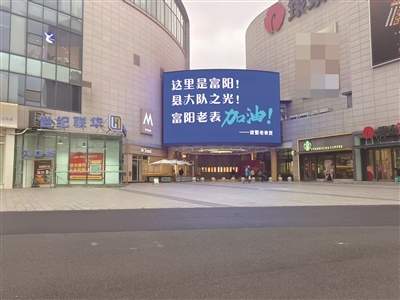 昨日,富阳城区几个主要商业街区内的电子屏上滚动播放着诸暨篮协发来的祝贺标语:“这里是富阳 我们是四强!”“县大队之光!富阳老表,加油!”“富阳队,砸砸掼进!富阳浙江王!”