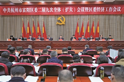 2026年1月8日,区委二届九次全体(扩大)会议暨区委经济工作会议举行。全会深入学习贯彻党的二十届四中全会精神和习近平总书记考察浙江重要讲话精神,全面落实省委十五届八次全会、市委十三届十次全会部署,审议通过《中共杭州市富阳区委关于制定国民经济和社会发展第十五个五年规划的建议》,回顾区委二届七次全会以来工作,部署2026年重点任务,进一步动员全区上下忠实践行“八八战略”,继续以一流状态一流业绩,阔步开启富阳“十五五”跨越发展新征程,着力做强富阳在杭州大都市的“腰部”力量,提升联东带西、联城促乡的重要节点功能,高水平打造富裕阳光的现代版富春山居图,高质量建设社会主义现代化新型城区。