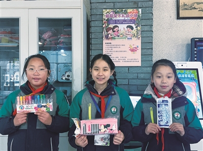 在孩子们兑换奖卡的“葡萄架下礼品小铺”,礼品丰富,不仅有笔记本、贴纸、笔等实物礼品,还有电子兑换券,比如和喜爱的校长合影、和校长共进午餐、体验一次升旗手、体验一天大队委等。