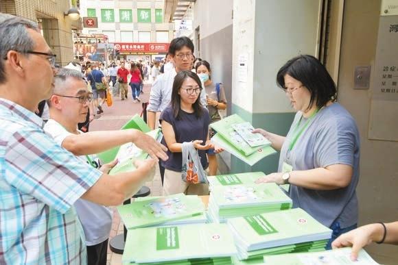 大批市民昨於灣仔民政處外領取新一份施政報告文本。 記者 崔俊良攝