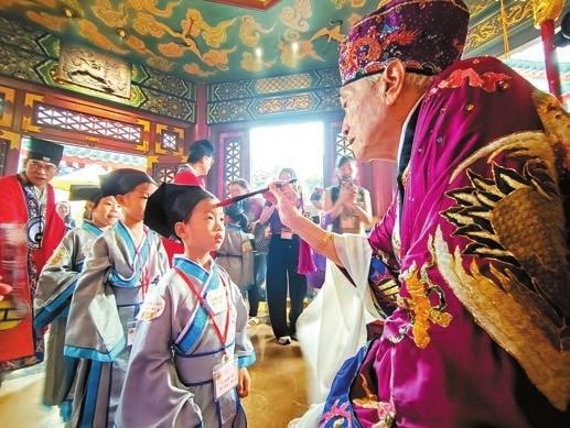 嗇色園黃大仙祠昨日第七度舉辦「萬世師表孔聖先師啟蒙開筆禮」,吸引150名今年9月入讀小一的學童參與。學童身穿傳統儒服,一同體驗象徵啟蒙開智的「開筆禮」。而黃大仙祠監院李耀輝(義覺)道長於「麟閣」內逐一以硃砂點痣於學童的額頭正中。「痣」音同「智」,寓意為孩童開啟智慧,從此眼明心亮。