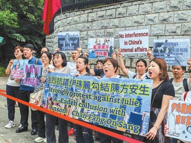 曾插手干預香港事務,被批「顛覆專家」的美國駐港澳總領事伊珠麗(Julie Eadeh)上月履新。有消息指,其上任後故態復萌,企圖勾結亂港分子陳方安生禍亂香港。昨日,多批香港市民自發前往美國駐港總領館抗議,強烈譴責伊珠麗勾結亂港分子,直指其行為可恥。