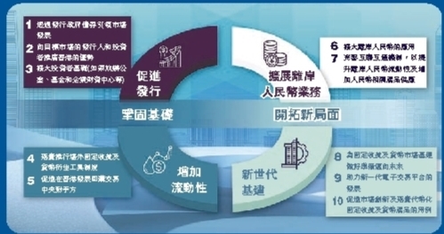 這份全新路線圖由證監會及金管局去年成立的「固定及收益及貨幣專責小組」制定。路線圖涵蓋促進一級債券市場發行、促進二級債券市場流動性及高效風險及流動性管理、擴大離岸人民幣業務以及開發未來固定收益及貨幣基建四大領域,合共有10項措施。。